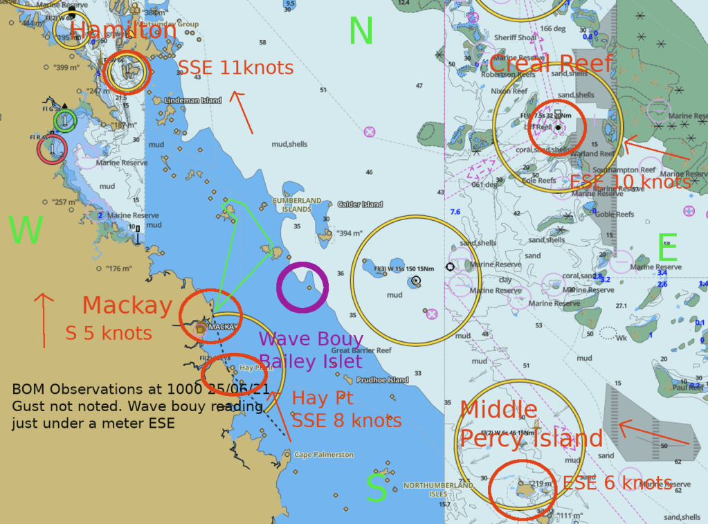 This map is of the BOM’s weather stations and their wind readings in red and our track out of Mackay in flouro green.