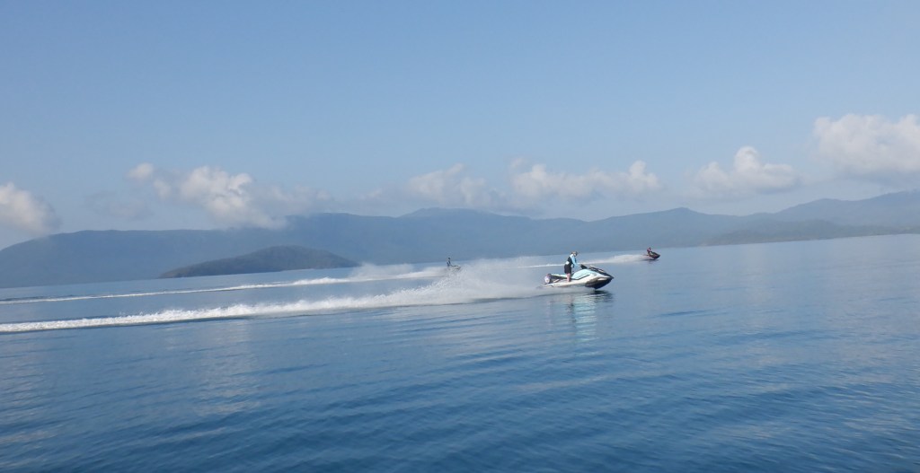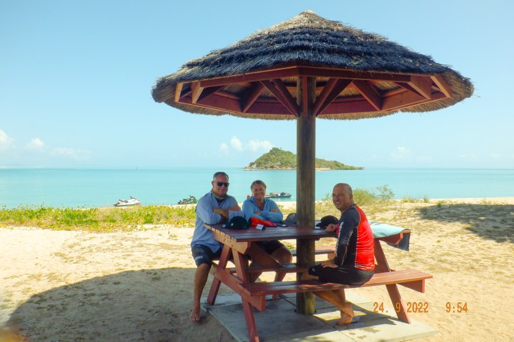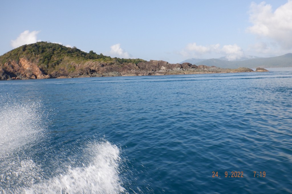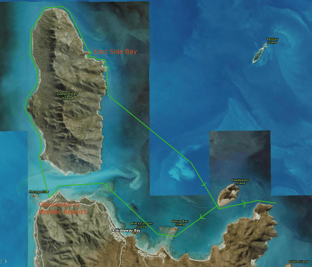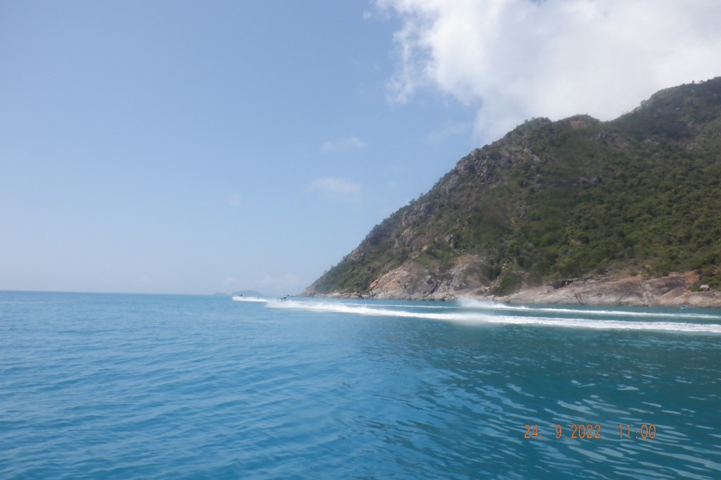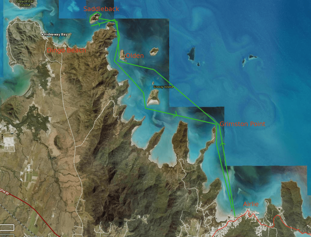Moving on down the Island a bit further we depart back to Saddleback Island still on a flat surface. Stopping occasionally for turtles or a break we make for Airlie with a chop starting from around Olden Island and building a little and traveling with it. Out of the water by 1330. Mornê’s drone show below.