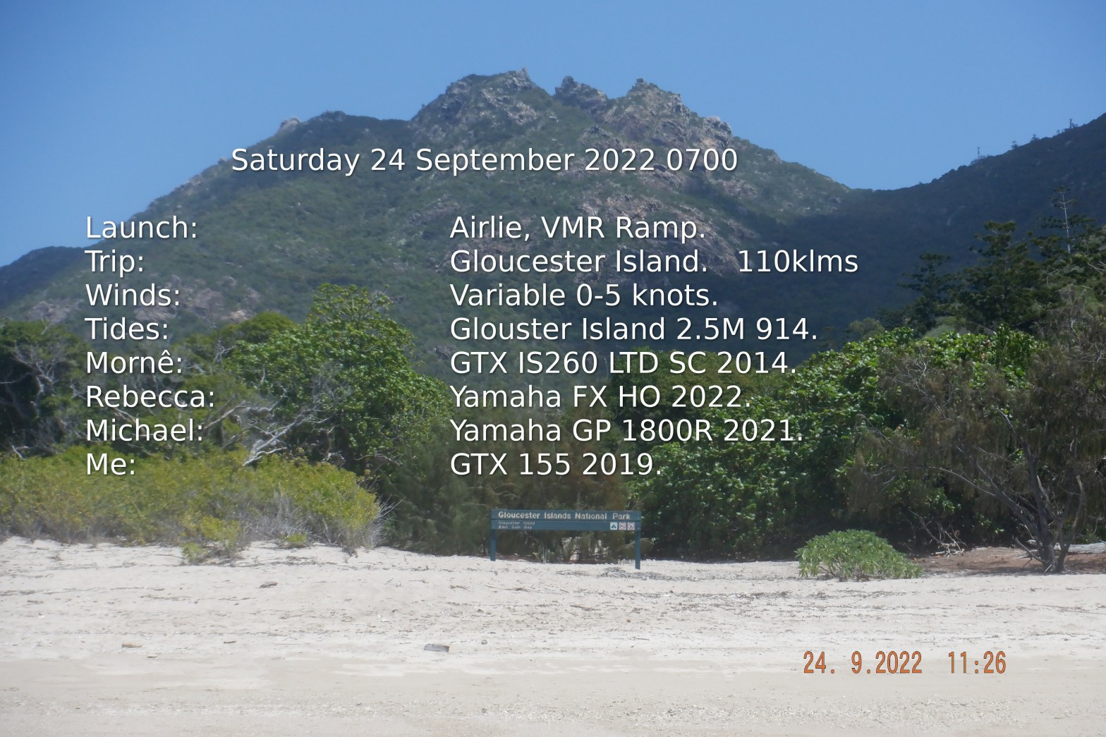 I was Not going but that was only until I woke up at 3am thinking should I go? at 318 decision made. Fueled up and text Mornê at 424 ” Am going to Airlie doing Gloucester maybe Bowen ” They including Rebecca & Michael were unsure of what they were doing. Arriving boat ramp 2 hours later the crew turn up and plan is made.