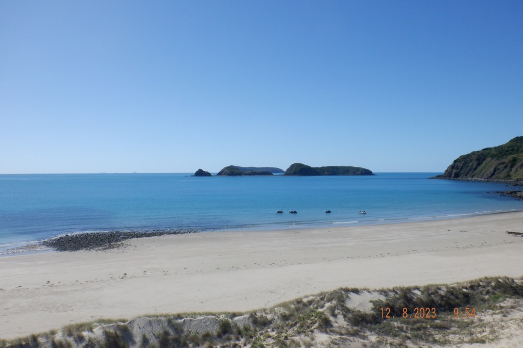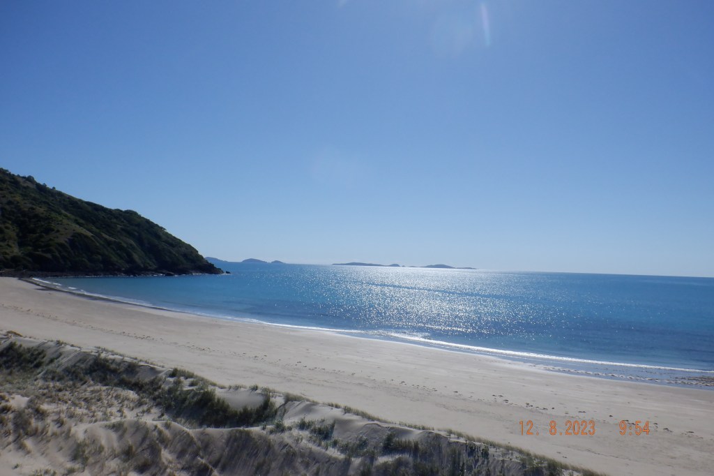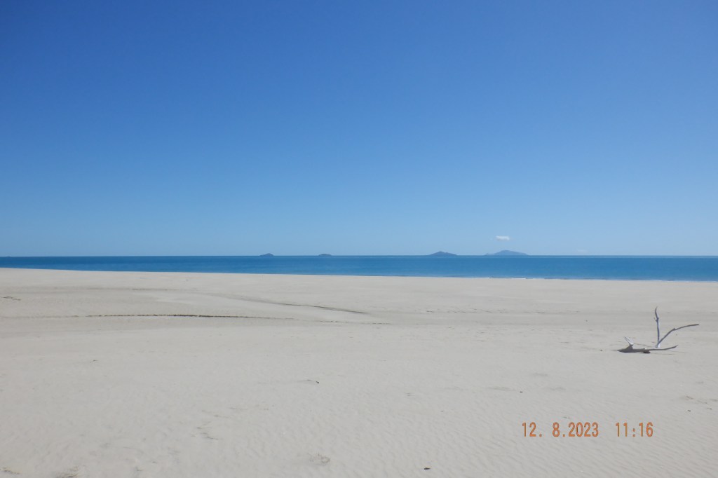 Great beach with blue water looking north towards Knight then Prudhoe the larger 2 Islands to the right.