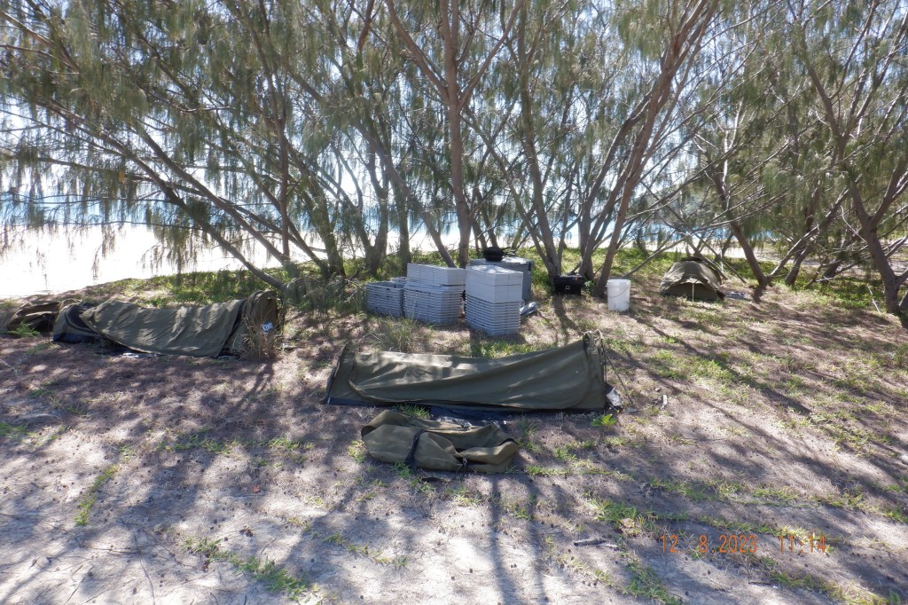 Went for a walk up the beach looking for possible waterhole and come across this camp of 3 swags, large esky, cooking utensils and many crates with lids ? We had seen a boat leaving as we arrived lucky buggers.