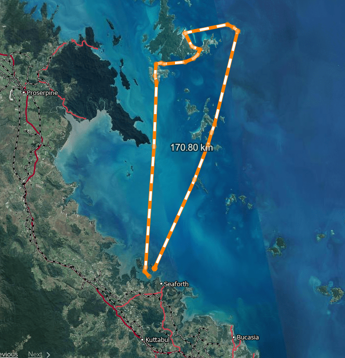 So off we go again and I clowning around jumping and turning on waves and my ski spits me out. My first fall in 750 hrs it had to happen eventually. Hope thats done for another 750 hrs or more. So my plan to run northerly to Cape Conway and run ENE towards Lindeman through to Pentacost and across to Whitsunday was scratched. Instead we we ran from Cape Conway that was flat turning a little lumpy closing the Cape past the Cape it was flat again then directly to Hamilton one of my not so favourite places that i avoid but had no intention to go in so a passby was acceptable. This route was going to keep us in the forecasted quieter winds and it was flat.