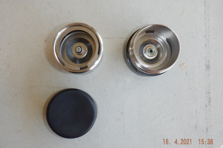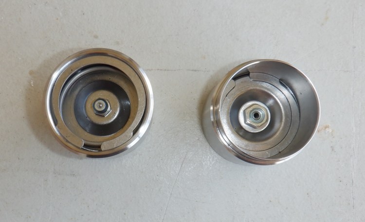 The left side is the outside showing grease nipple with dust cap. The right is the inside showing nut that retains nipple, dust cap fitted.