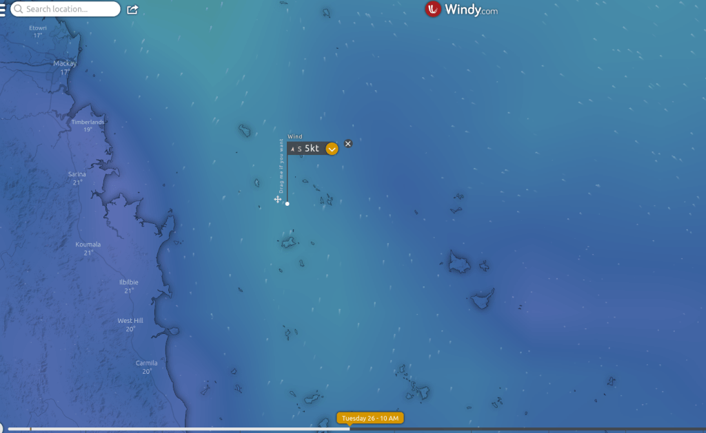 Beverly Group out of Grasstree 130km return run. Forecast Tuesday 26th July 5knots South turning East at 1500hrs. Tide is 4.68M at 0943 Hay Point. First time for me out too this area. Times and speed are only a estimated scenario for planning a run a bit like the forecast ? Gives a foundation to work with not necessarily stick to.