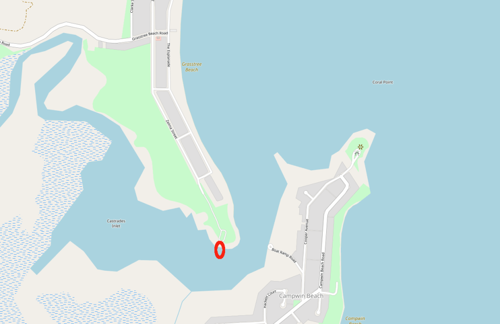 Located Grasstree Beach on Castrades Inlet that Cabbage Teee Ck flows into. Near all tide ramp with floating jetty and good trailer parking public toilets at the beach. Newly upgraded ramp and jetty, with plenty of parking.