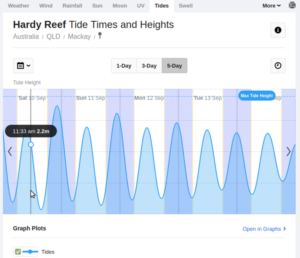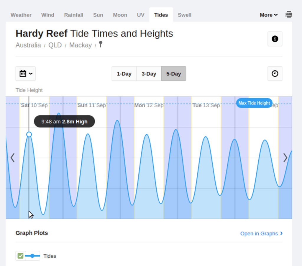 Tides aren’t great but doable excepting an early start. Highs 10th 0948, 11th 1024 both at 2.8M 700mm better than last trip 29 July 2021. Foundations of a plan with some of my research and recommendations that you should scrutinise. Looking back I estimate that we crossed the reef with tide at 1.9M that gave us 700mm of water and a bit less at times.
