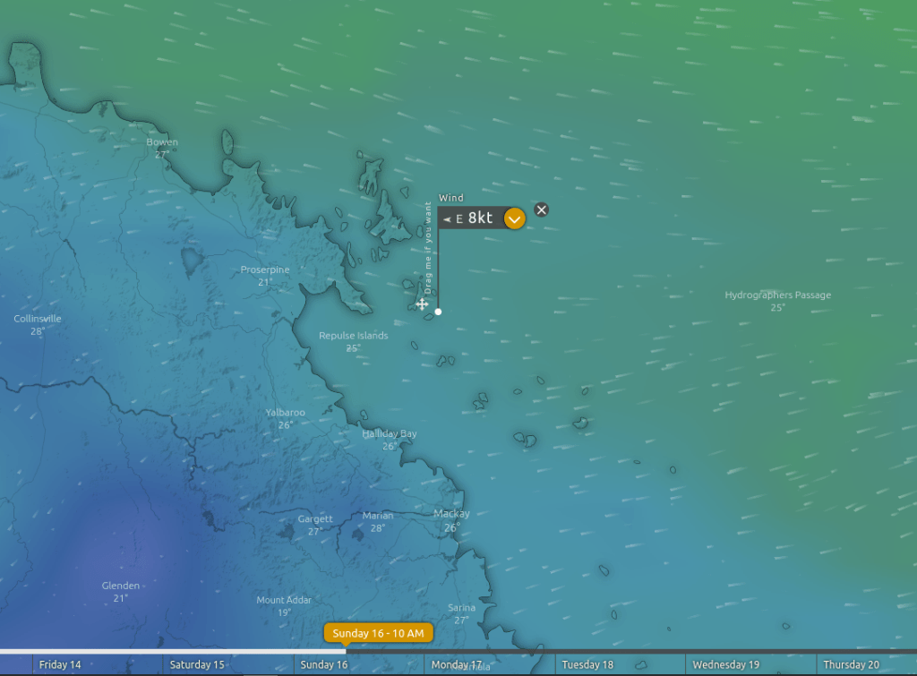 Wind forecast as of 13/10/22 for Sunday 16/10/22 is variable 8knots slight strengthen after 1400 for this area. See update for yourself https://www.windy.com/?2022101603,-20.908,150.139,9,m:c43akjI